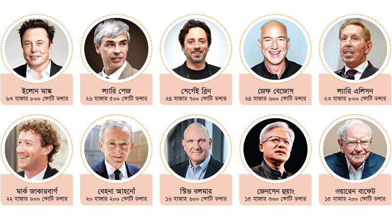 বিশ্বের শীর্ষ ১০ ধনকুবেরের সম্মিলিত সম্পদের পরিমাণ ২ লাখ ৫০ হাজার কোটি (২ দশমিক ৫ ট্রিলিয়ন) ডলার ছাড়িয়েছে। চলতি বছরের ১৬ ডিসেম্বর পর্যন্ত এ তালিকায় থাকা ব্যক্তিদের মোট সম্পদের পরিমাণ দাঁড়িয়েছে ২ লাখ ৫৩ হাজার ৬০০ কোটি ডলারে। বছরের শুরু থেকে এসব ধনকুবেরের মোট সম্পদ বেড়েছে ৫৫ হাজার ৮৯০ কোটি ডলার বা ২৮ শতাংশেরও বেশি। ব্লুমবার্গ বিলিয়নেয়ারস ইনডেক্সের পরিসংখ্যানের ভিত্তিতে এসব তথ্য জানিয়েছে সংবাদ সংস্থা আনাদোলু। তালিকায় থাকা ১০ জনের মধ্যে নয়জনই যুক্তরাষ্ট্রের নাগরিক। বাকি একজন ফ্রান্সের। তাদের মধ্যে আটজনই সরাসরি প্রযুক্তি খাতের সঙ্গে যুক্ত। বিশ্লেষকদের মতে, কৃত্রিম বুদ্ধিমত্তা (এআই), ক্লাউড কম্পিউটিং ও ডিজিটাল সেবাভিত্তিক ব্যবসার দ্রুত বিস্তার তাদের সম্পদ বৃদ্ধির প্রধান কারণ।