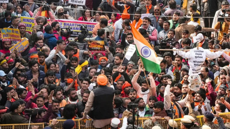 ভারতের রাজধানী ন দিল্লিতে বাংলাদেশ হাইকমিশনের সামনে হিন্দুত্ববাদী দল বিশ্ব হিন্দু পরিষদ (ভিএইচপি) ও বজরঙ্গি দল ফের বিক্ষোভ করেছে। মঙ্গলবার (২৩ ডিসেম্বর) এই বিক্ষোভ শুরু হওয়ার পর শতাধিক মানুষ হাইকমিশনের সামনে জড়ো হয়। তারা বাংলাদেশ বিরোধী স্লোগান নিয়ে পুলিশের ব্যারিকেড ভেঙে ফেলার চেষ্টা চালায়। বিক্ষোভের কর্মসূচি সামনে রেখে সকাল থেকে বাংলাদেশ হাইকমিশন ঘিরে নিরাপত্তা ব্যবস্থ্যা জোরদার করা হয়। বিক্ষোভকারীরা পুলিশের ব্যারিকেড ভেঙে হাইকমিশনে প্রবেশের চেষ্টা করলে পুলিশ তাদের লাঠিচার্জ করে সরিয়েছে। ভারতীয় সংবাদ মাধ্যমের খবর অনুযায়ী, বাংলাদেশ হাই কমিশন সংলগ্ন পুরো এলাকায় তিন স্তরের ব্যারিকেড দিয়ে ঘিরে রাভা হয়েছে। নিরাপত্তা নিশ্চিত করতে প্রচুর পুলিশ ও আধাসামরিক বাহিনী মোতায়েন করা হয়েছে। বাংলাদেশে হিন্দু সম্প্রদায়ের ওপর নির্যাতনের অভিযোগ তুলে কয়েক দিন ধরেই ভারতে বিক্ষোভ চলছে। বিক্ষোভের মূল কারণ হিসেবে ময়মনসিংহের ভালুকায় দীপু দাস নামের এক যুবকের হত্যাকাণ্ডকে উল্লেখ করা হচ্ছে।
