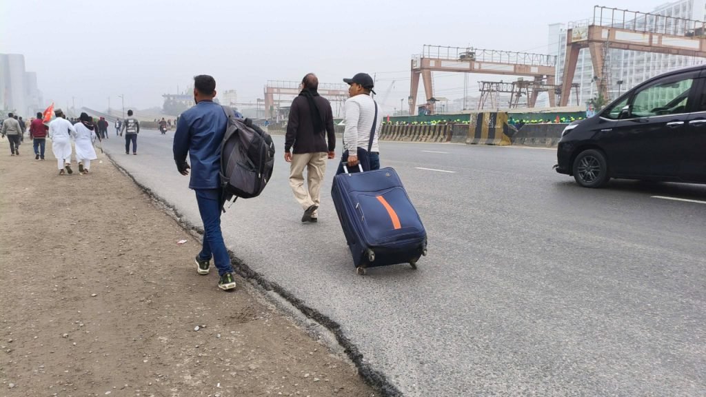 আরও দেখা গেছে, যানবাহনের অভাবে অনেকে লাগেজ সঙ্গে নিয়েই পায়ে হেঁটে রওনা হচ্ছেন গন্তব্যের উদ্দেশ্যে। কোনো কোনো প্রবাসী গাড়ি না পেয়ে মালামাল মাথায় তুলে হাঁটা ধরেছেন। গাড়ি না পেয়ে কেউ কেউ ছোট বাচ্চাসহ হেঁটে রওনা হয়েছেন।