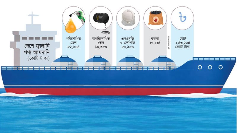 বাংলাদেশ ব্যাংকের তথ্য অনুযায়ী, ২০২৪-২৫ অর্থবছরে মোট ১ লাখ ৪৩ হাজার ২৬৪ কোটি টাকার জ্বালানি পণ্য আমদানি করা হয়েছে। এর মধ্যে ৫২ হাজার ৯৬৪ কোটি টাকার পরিশোধিত জ্বালানি তেল আমদানি করেছে বাংলাদেশ। একই সময়ে অপরিশোধিত জ্বালানি তেল আমদানি হয়েছে ১৩ হাজার ৩৮০ কোটি টাকার। আর এলএনজি ও এলপিজি আমদানিতে আরো ৫৯ হাজার ৯০৬ কোটি টাকা ব্যয় হয়েছে। কয়লা আমদানিতে ব্যয় হয়েছে ১৭ হাজার ১৪ কোটি টাকা।