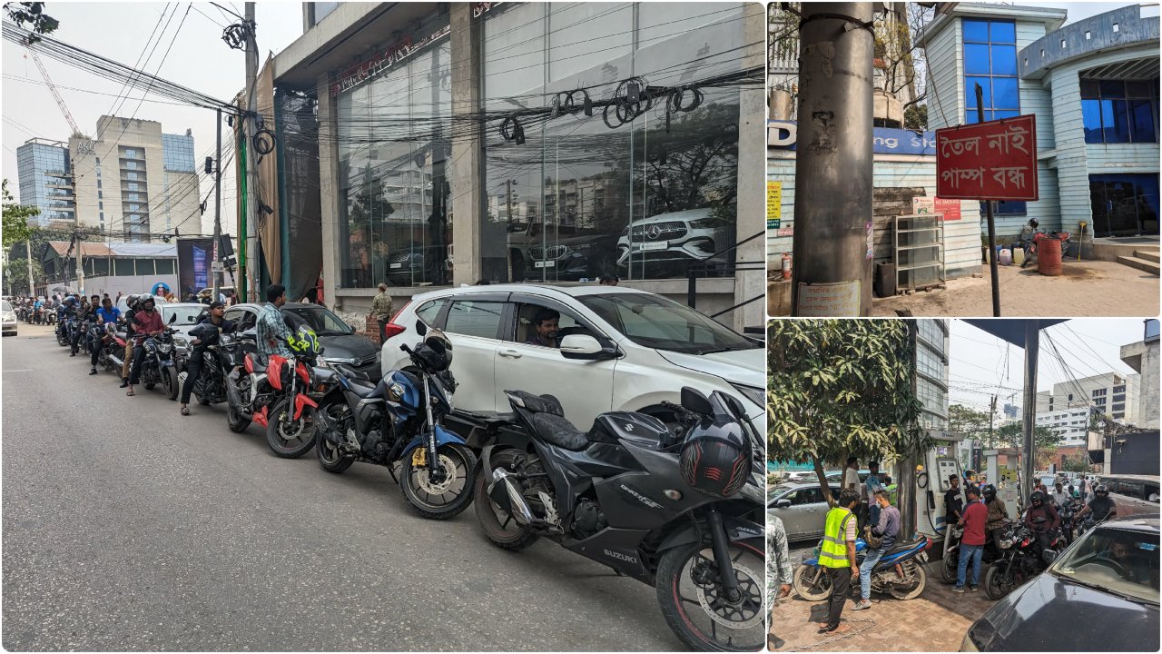 বিজয় সরণির ট্রাস্ট ফিলিং স্টেশনে সরকার ঘোষিত রেশনিং পদ্ধতিতে তেল বিক্রি করা হচ্ছে। এখানে তেল নিতে আসা যানবাহনের লাইন প্রধানমন্ত্রীর কার্যালয় পর্যন্ত ছাড়িয়ে গেছে। পাম্পের ম্যানেজার ব্রিগেডিয়ার জেনারেল জামাল হোসেন ঢাকা পোস্টকে জানান, তাদের মজুতে আপাতত সংকট নেই। তবে নিয়ম অনুযায়ী কোনো মোটরসাইকেল ৩০০ টাকার বেশি তেল কিনতে পারছে না। এতে ভোগান্তি হলেও তেল বিক্রি সচল রাখা সম্ভব হচ্ছে। সেখানে অপেক্ষমাণ পাঠাও চালক সামির বলেন, ঘণ্টাখানেক দাঁড়িয়ে আছি। ৩০০ টাকার তেলে আমার সারা দিন চলবে না। বাধ্য হয়ে অন্য পাম্পে আবার লাইনে দাঁড়াতে হবে। অন্যদিকে, তেজগাঁওয়ের আইডিয়াল ফিলিং স্টেশনে রেশনিং ছাড়াই চাহিদামাফিক তেল দেওয়া হচ্ছে। সেখানে বাইকারদের লাইন হাতিরঝিল পর্যন্ত পৌঁছেছে।