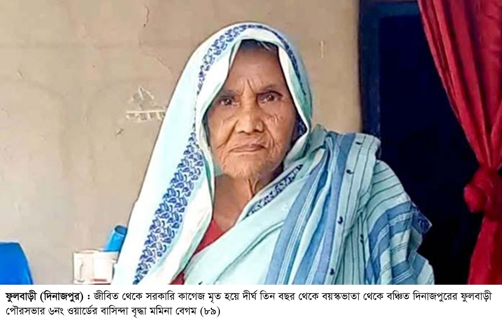 দিনাজপুরের ফুলবাড়ী উপজেলা পৌরসভার ৬নং ওয়ার্ডের তেঁতুলিয়া গ্রামের মৃত মকবুল হোসেনে স্ত্রী ৮৯ বয়স্ক বৃদ্ধা মমিনা বেগম। জীবিত থেকেও সরকারি খাতায় মৃত দেখানোর কারণে দীর্ঘ তিন বছর থেকে বয়স্কভাতা প্রাপ্তি থেকে বঞ্চিত হচ্ছেন এই বৃদ্ধা। ভুল ভেরিফিকেশন আর জনপ্রতিনিধির দায়িত্বহীন সুপারিশের কারণে তিন বছর ধরে বন্ধ রয়েছে তার বয়স্কভাতা। এতে চরম কষ্টে দিন কাটছে এই বৃদ্ধার।
