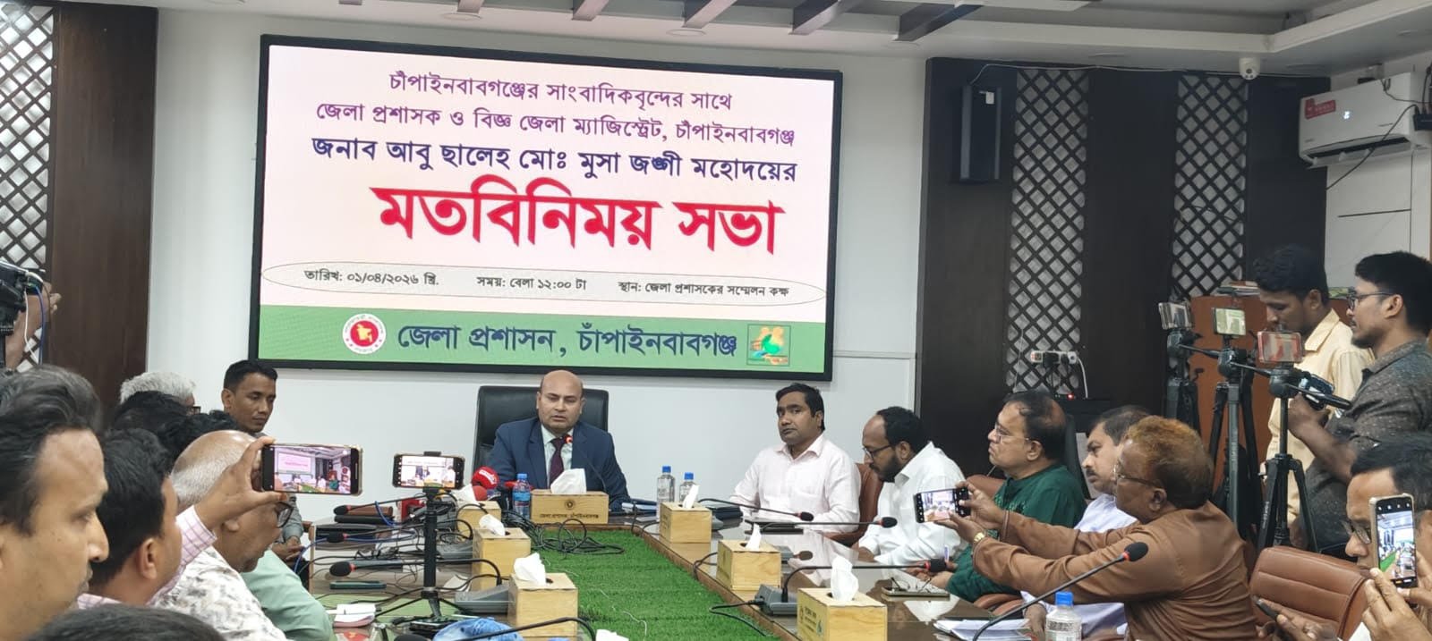 চাঁপাইনবাবগঞ্জ জেলার সার্বিক উন্নয়ন ও জনকল্যাণমূলক কর্মকাণ্ডে গণমাধ্যমকর্মীদের সহযোগিতা কামনা করে স্থানীয় সাংবাদিকদের সঙ্গে মতবিনিময় সভা করেছেন নবাগত জেলা প্রশাসক ও জেলা ম্যাজিস্ট্রেট আবু ছালেহ মোঃ মুসা জঙ্গী। বুধবার (১ এপ্রিল) বেলা ১২টায় জেলা প্রশাসকের সম্মেলন কক্ষে জেলা প্রশাসনের আয়োজনে এ সভা অনুষ্ঠিত হয়। এতে জেলার বিভিন্ন প্রিন্ট ও ইলেকট্রনিক মিডিয়ার কর্মরত সাংবাদিকরা অংশগ্রহণ করেন।