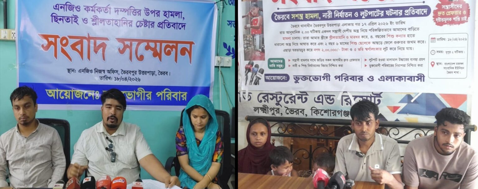 সুলেমান মিয়া অভিযোগ করেন, ১৭ এপ্রিল শুক্রবার রাত ২টার দিকে পূর্ব বিরোধের জেরে প্রতিপক্ষ মাসুদ আলমসহ ৮-১০ জন যুবক দেশীয় অস্ত্র নিয়ে তার বাড়িতে হামলা চালায়। এ সময় তার স্ত্রী ইমা বেগম এবং তাদের ৪ বছরের শিশুকন্যা ও আড়াই বছরের পুত্রশিশুকে আহত করা হয়। তাছাড়া ঘরের আসবাবপত্র ভাঙচুর করে নগদ ২ লাখ টাকা ও প্রায় ৫ ভরি স্বর্ণালংকার লুট করে নিয়ে যায় বলে অভিযোগ করেন তিনি। সুলেমানের স্ত্রী ইমা বেগম জানান, ওই দিন রাতে তাদের বাড়িতে হামলার সময় তাকে মারধর ও শ্লীলতাহানি করা হয়। তার দুই শিশুসন্তানও হামলা থেকে রেহাই পায়নি। এ ঘটনার সুষ্ঠু তদন্তপূর্বক বিচার দাবি করেন ইমা বেগম দম্পতি। এই ঘটনায় ভৈরব থানার অফিসার ইনচার্জ (ওসি) আতাউর রহমান আকন্দ বলেন, দুই পক্ষই অভিযোগ করেছেন। ঘটনার তদন্ত করে প্রয়োজনীয় আইনগত ব্যবস্থা নেওয়ার আশ্বাস দেন তিনি।